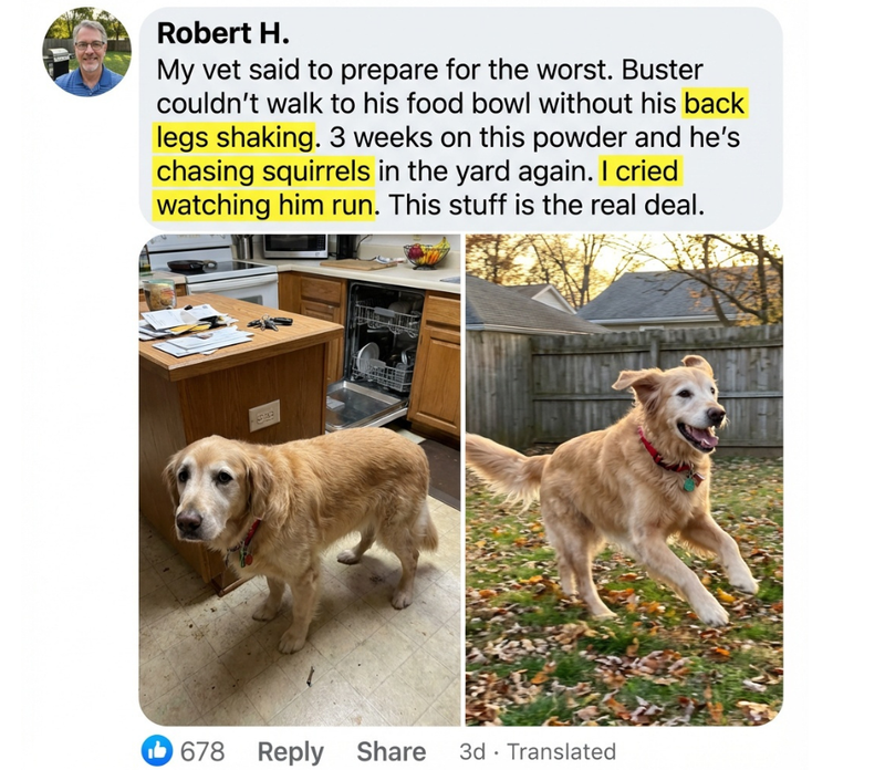 Had to leave a review because I didn't expect this to actually work. My old boy is 11 and his back legs were getting bad and wouldn't go on walks anymore, just laid around. My wife found this and honestly I rolled my eyes. 3 weeks later he's following me to the garage again. Standing corrected.