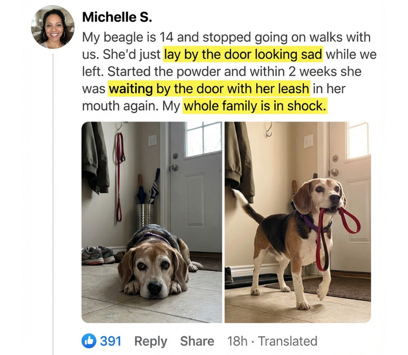 My sweet girl is 14 and I thought her slowing down was just age. Tried this because my neighbor recommended it for her dog. 2 weeks in and she's back to following me around the house again. I got my shadow back