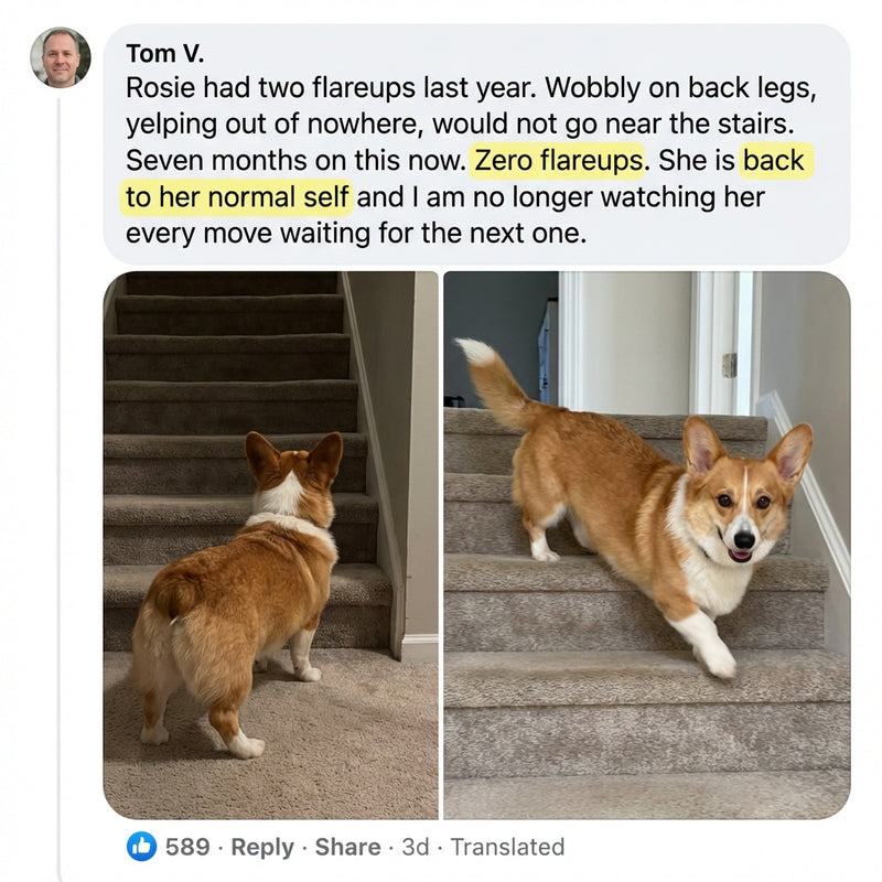 My Corgi is only three and the vet told me he is already at high risk because of his build. No episode yet but I started this as a preventative measure two months ago. He is more fluid when he moves and the stiffness he had after long walks is basically gone. Hopefully we never need surgery but at least I feel like I am actually doing something about it now.